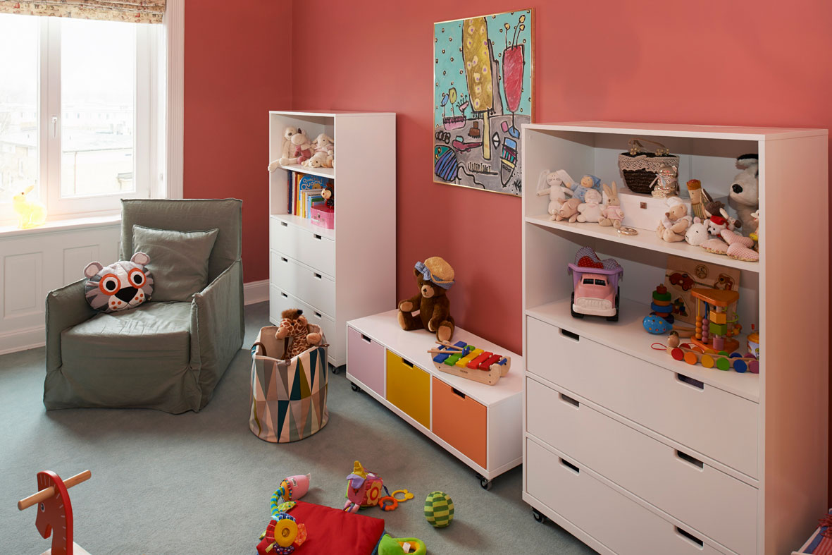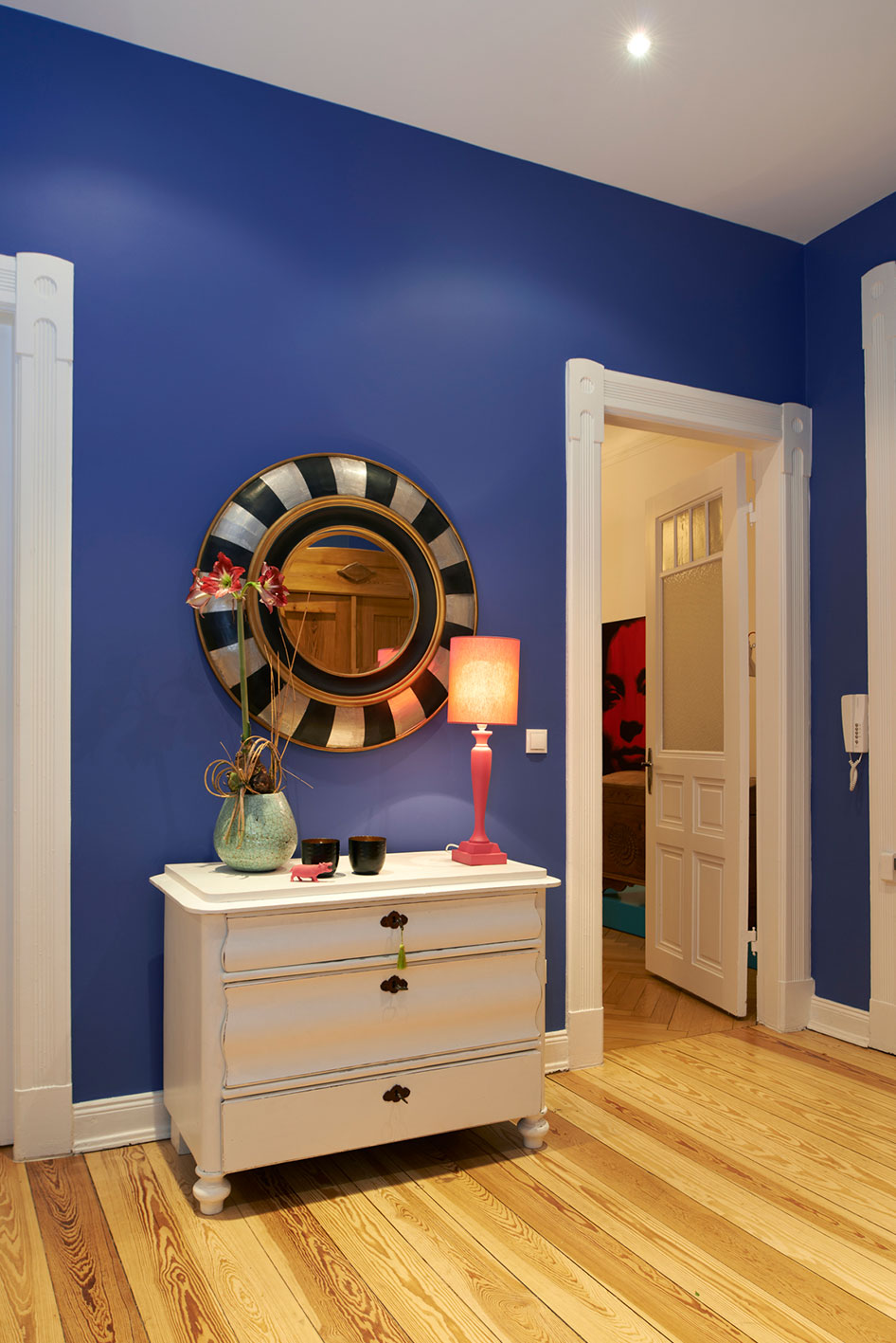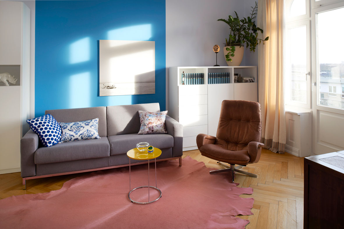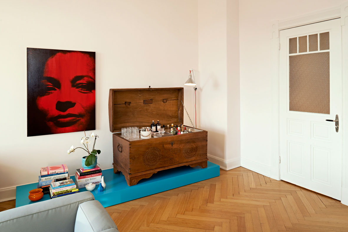 Das alte Sofa als Familienerbstück findet hier ebenso seinen Platz wie das mit viel Liebe zum Detail gestaltete Kinderzimmer oder die auf Maß gefertigte kleine Hausbar. Ausdrucksstarke Farben unterstreichen das Lebensgefühl der jungen Familie und setzen ein klares Statement.