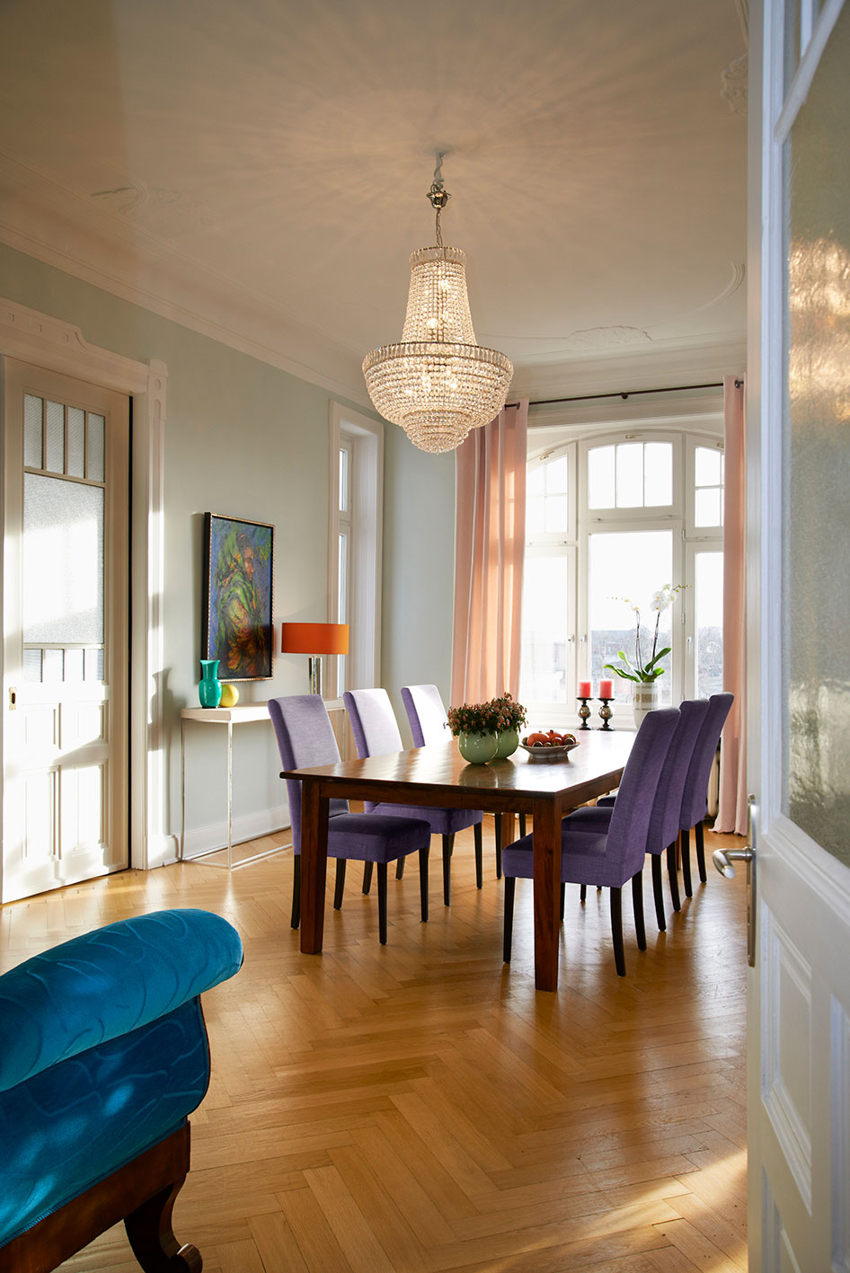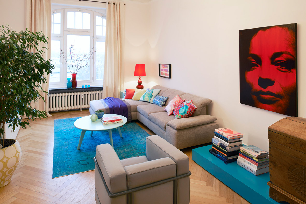 Der Wunsch meiner Kunden war es, Ihrer gerade bezogenen Altbauwohnung in Alsternähe auf der Uhlenhorst eine ganz individuelle Note zu verleihen. Gewünscht waren ein Stilmix aus Alt und Neu und eine Farbvorstellung, die ein bisschen an Miami erinnert.